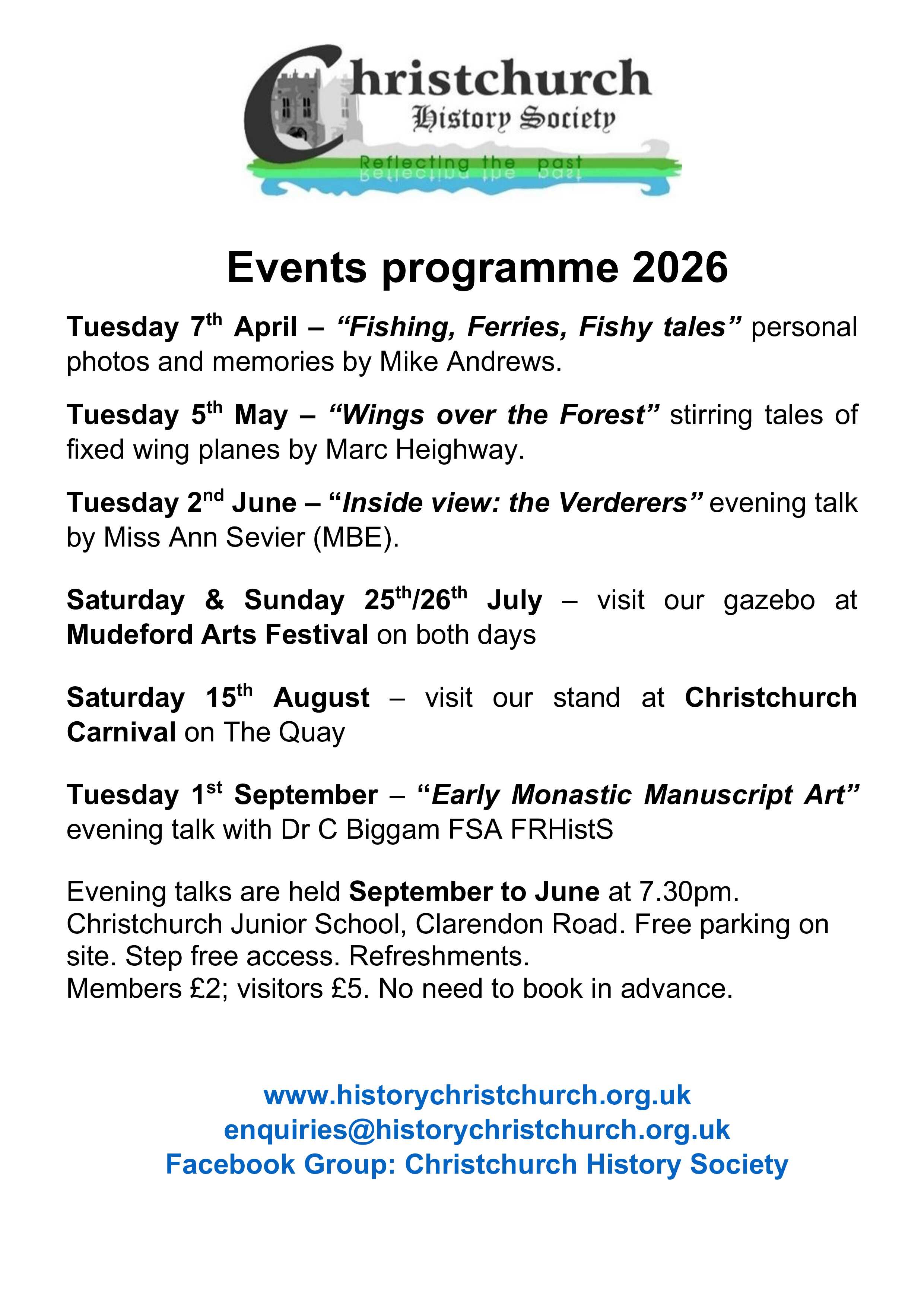 With an extensive archive of books, old documents and photographs, as well as access to most copies of the local newspapers from 1855 to 1983, we can help you to learn more about the people, events and places that have created the ancient town of Christchurch and Christchurch Borough that we know today. We have a programme of ten monthly talks, September to June, at Christchurch Junior School, Clarendon Road, Christchurch: Members - £2.00. Visitors - £5.00.